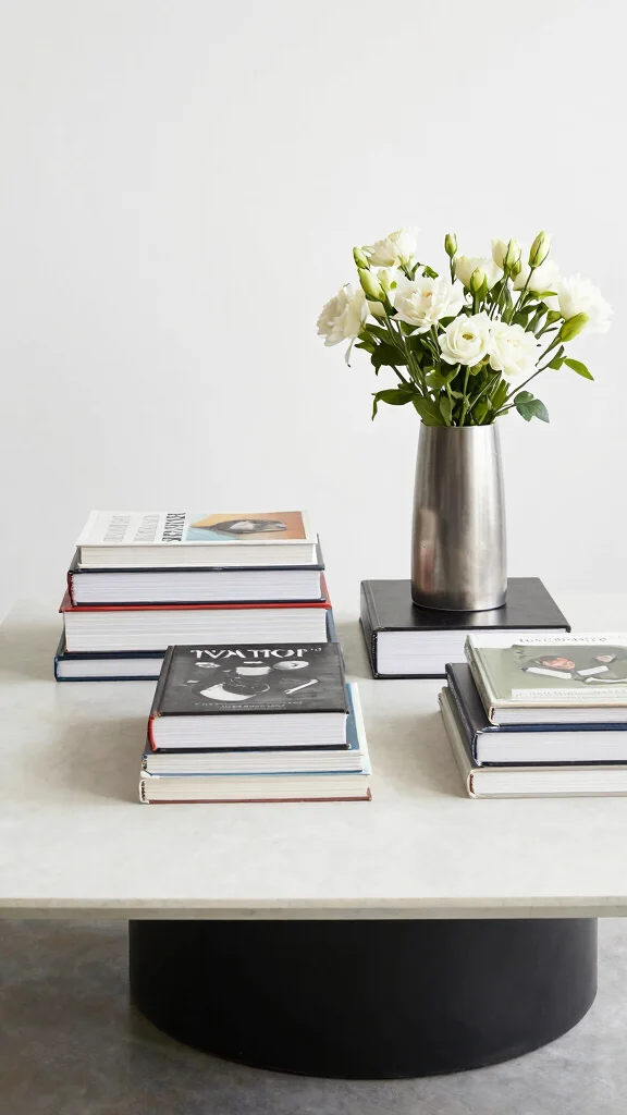 Transform your coffee table books into a stylish base for other decorative elements. A larger book can serve as a platform for a striking vase or a favorite candle, adding layers and visual interest to your arrangement. This technique creates a chic focal point in your living area without overwhelming.