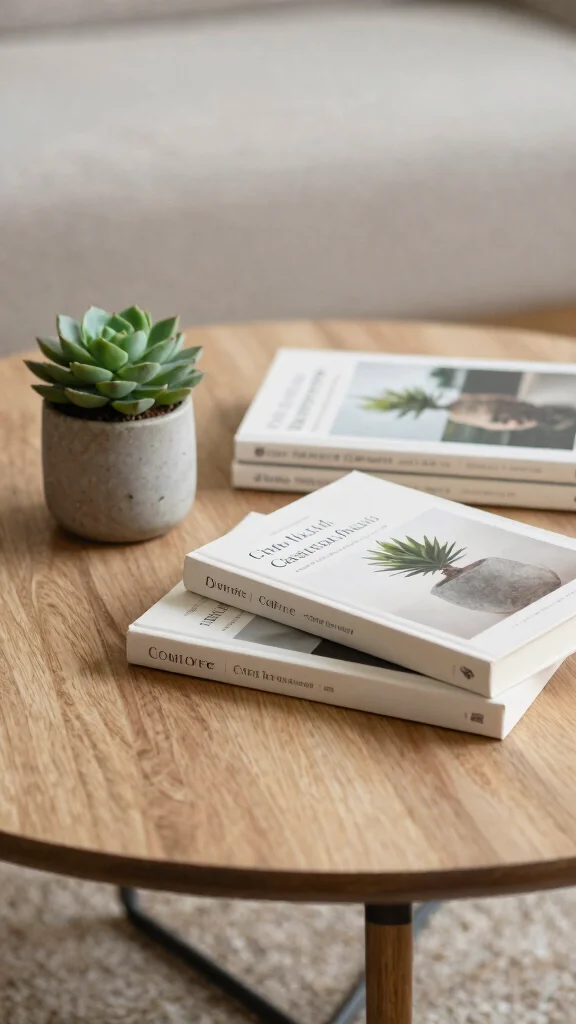 Bringing nature into your decorating with coffee table books adds life without clutter. Keep it simple: one small plant or succulent next to your books, choose low-maintenance varieties, and let the greenery soften the look in minimalist spaces.