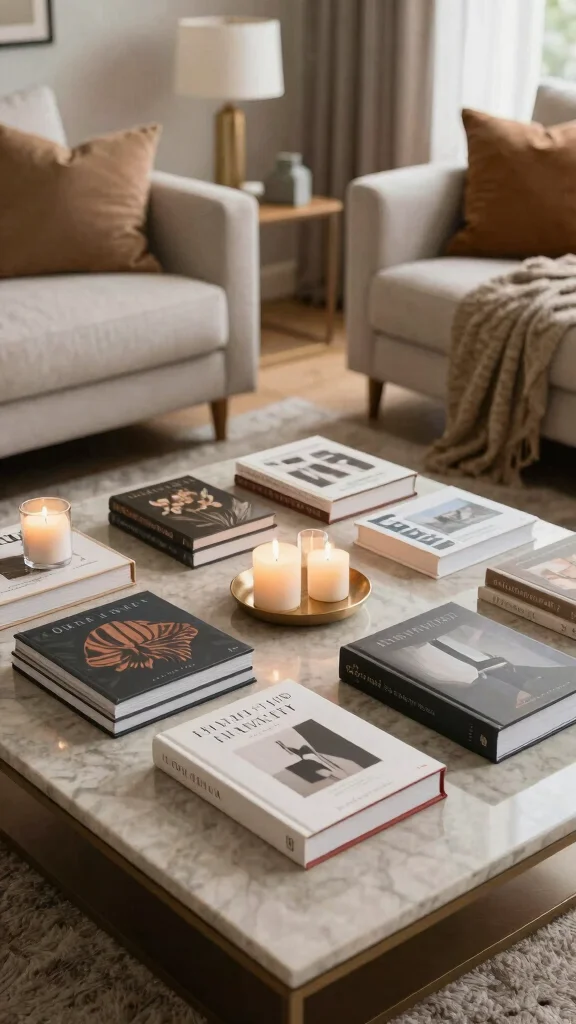 Limit the number of titles on the table (3–4 works well) and vary their orientation to create visual interest. Use a simple tray or shallow box to group books and a couple of accessories, like a small planter or candle, to anchor the display. Keep surface clear elsewhere and choose interior design books that coordinate with your home decor inspiration palette for a cohesive look in a stylish living room.