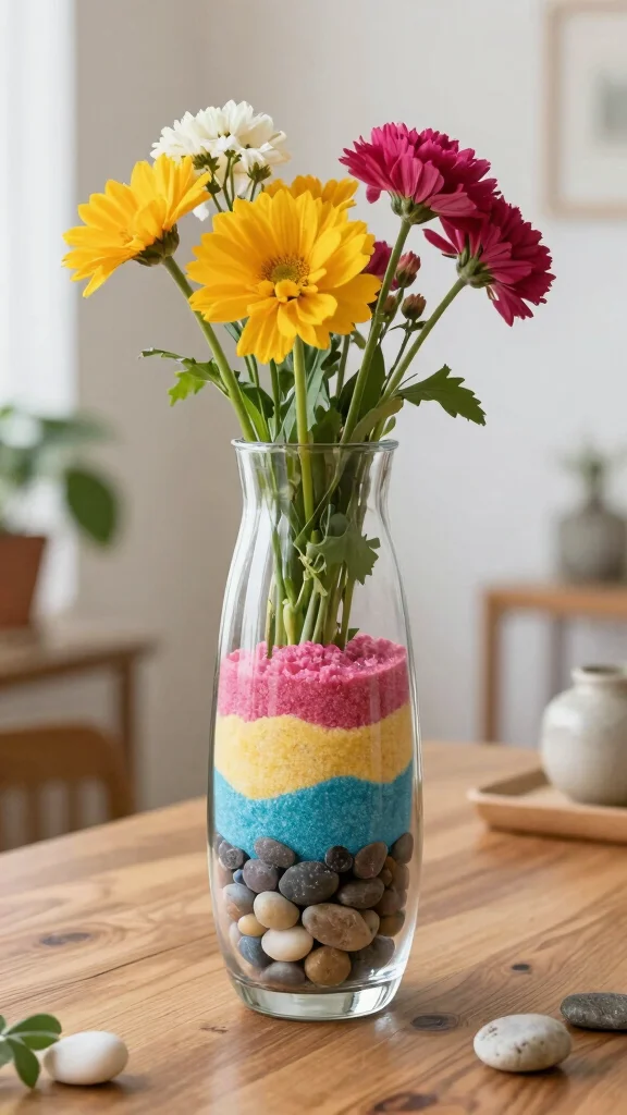 For a playful centerpiece, consider using glass beads at the base of your vases. These colorful beads add a pop of color while supporting the flowers, and you can choose hues that match or contrast with your floral arrangements for an eye-catching display.