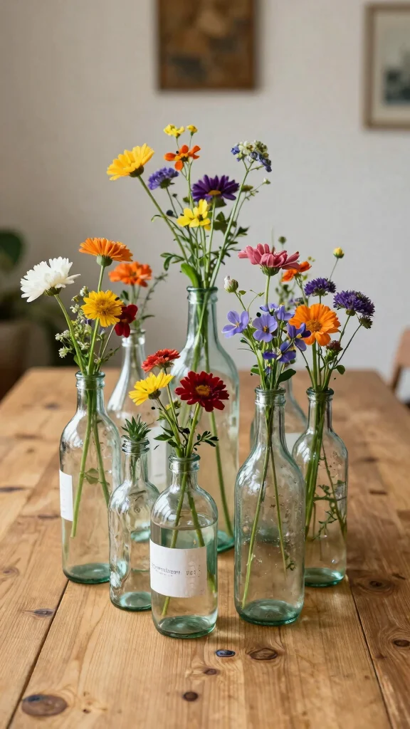 To style your bottles, clean them thoroughly and either leave them as is or paint them for added flair. Using single stems or wildflowers creates a relaxed look, and mixing different bottle sizes enhances visual interest.