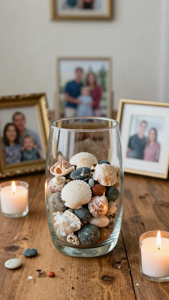 Select items like seashells from a beach trip, colorful stones, or even photographs to include in your arrangement. Layering sand or pebbles can help separate items for added depth and interest.