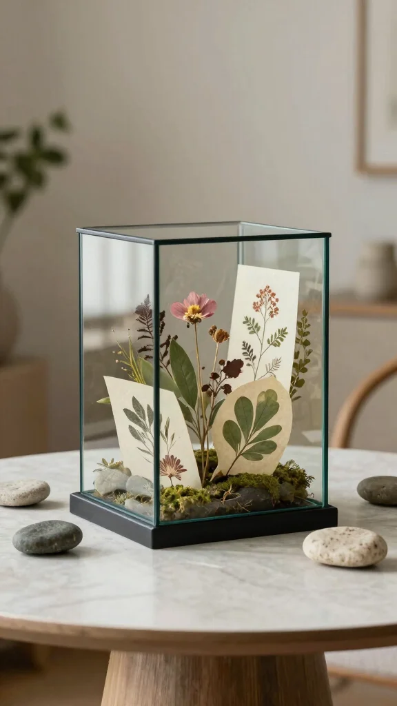 For a modern centerpiece, consider using glass cases filled with botanical prints or pressed flowers. This stylish approach celebrates nature’s beauty in a unique format, offering a contemporary twist to traditional arrangements.