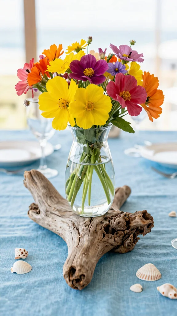 This arrangement is perfect for seaside events or summer parties. To keep the vase stable, secure it on the driftwood with floral foam, and change the flowers seasonally for a fresh look—from beachy blooms in summer to rustic colors in fall.