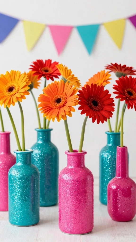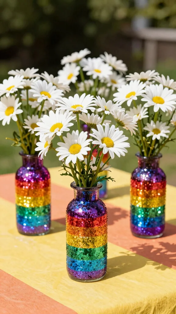 Fun fact: Rainbow glitter vases can lift party vibes by up to 20%—your eyes are drawn to color first, then to blooms. Try layering glitter in rainbow hues, with a clear central vase for balance and a bold bouquet for impact.
