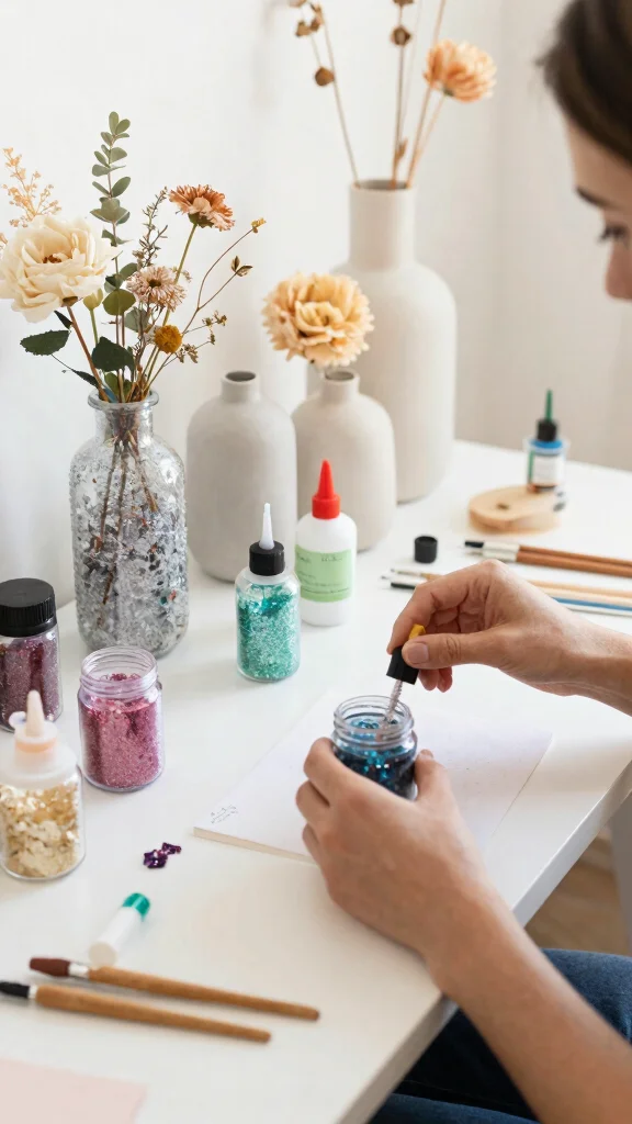 To make DIY glitter crafts vases, gather simple supplies: clear glass vases, fine glitter, Mod Podge or clear craft glue, a brush or sponge, painter’s tape, and a sealer. Choose a base color and glitter shade that fits your theme, and test a small amount on the inside or outside. Apply glue, sprinkle glitter, and let it dry fully; seal with a clear topcoat to reduce shedding for long-lasting sparkle. These materials help you craft glitter vases that blend into sparkle home accessories and decorative vases in your space.