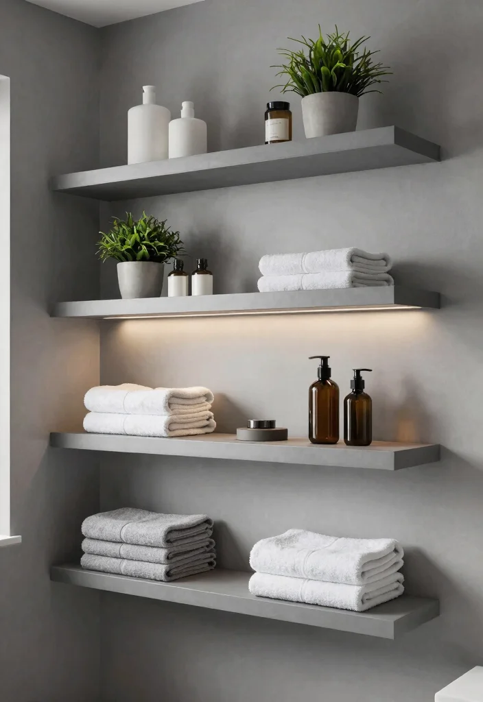 Grey wall shelves not only maximize your bathroom’s storage but also add a stylish element that enhances the overall design.