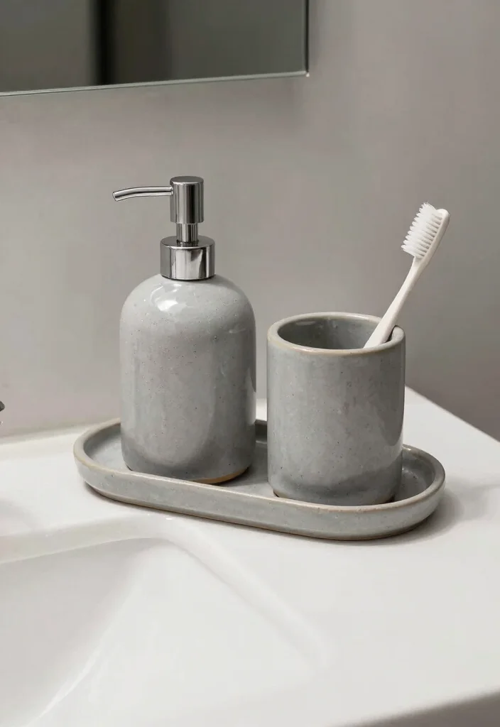 Pick 3–5 pieces like a soap dispenser, toothbrush holder, storage jars, and a shower caddy in coordinated greys. Add a metallic accent to bring warmth and contrast (brushed brass, nickel, or bronze).