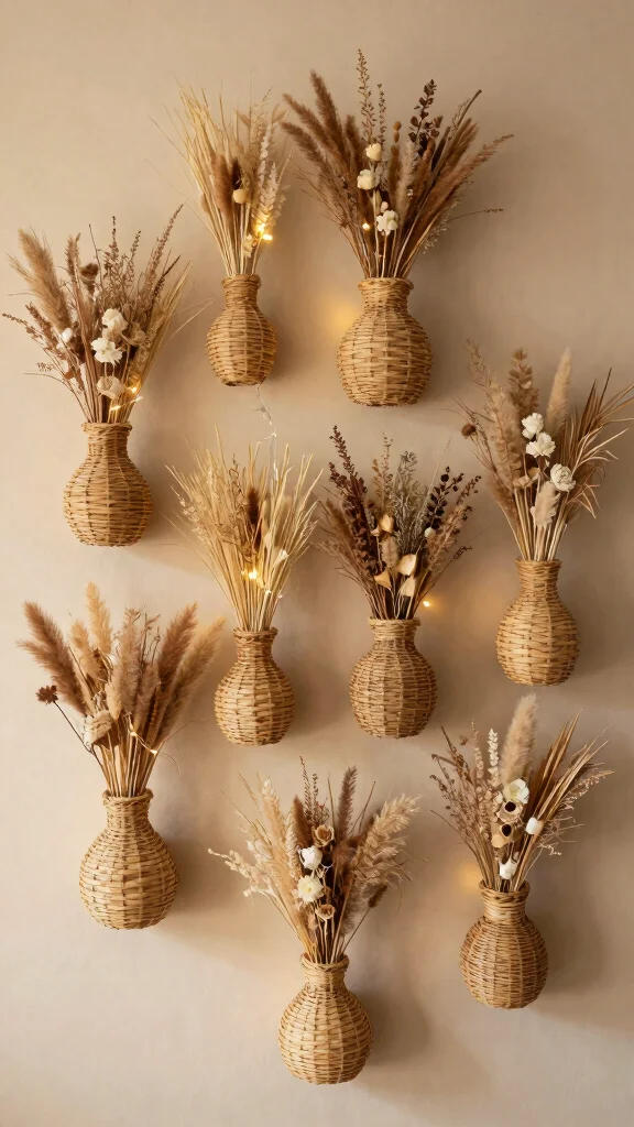 Woven wall basket vases introduce natural textures into your decor. These rustic baskets beautifully showcase dried flowers, grasses, or even lightweight fresh blooms. When hung in clusters, they create a vibrant, bohemian-inspired wall that radiates warmth and charm.