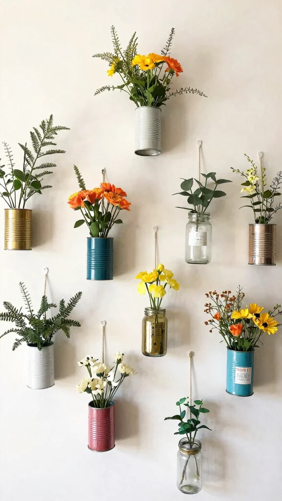 Decorate your repurposed items with twine or paint to match your style. Hanging them at different heights creates an interesting visual display, filled with fresh flowers or dried grasses for a charming eco-friendly vibe.