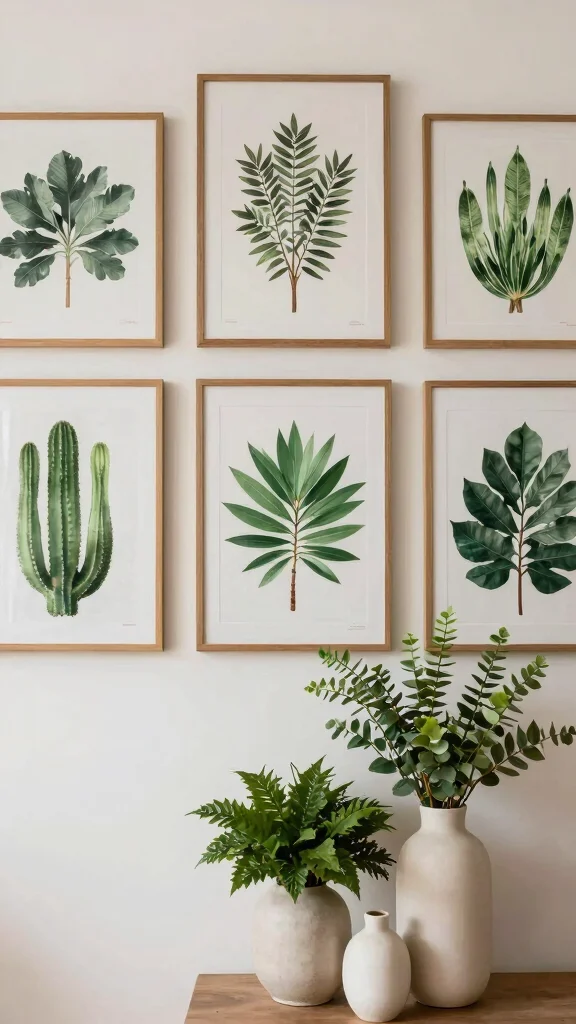 Opt for prints that harmonize with the colors of the flowers in your vases for a unified look. This setup transforms your wall into a gallery, merging art and greenery in a delightful way.