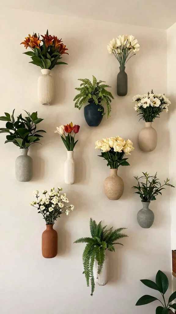 Mix textures and colors to keep it affordable and chic: combine matte ceramic with metal or glass, and stick to a cohesive color palette for wall vase decor that doubles as apartment wall art.