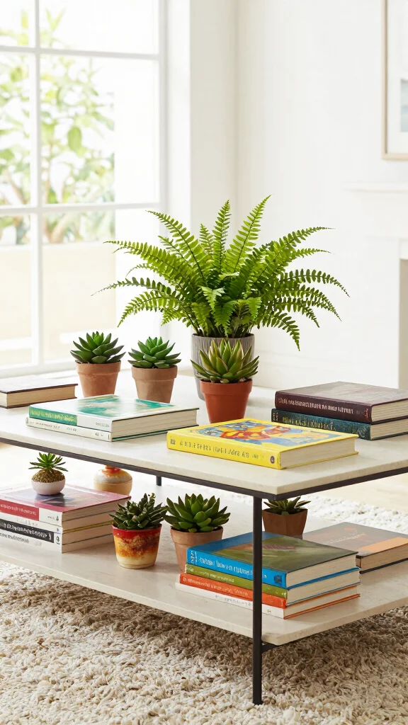 Integrating plants with your coffee table books is a fantastic way to enliven your display. Small potted succulents, vibrant ferns, or even terrariums add a touch of nature and freshness to your decor. Position the plants beside or even atop your book stacks for a whimsical, inviting arrangement.