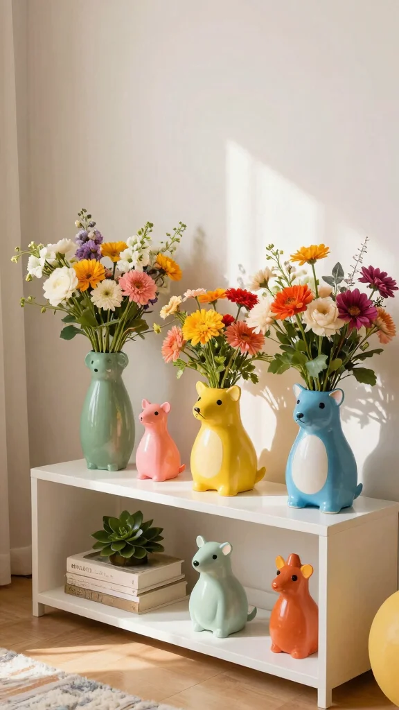 Incorporating whimsical animal-shaped vases into your decor enhances your living space with a touch of playfulness and creativity.
