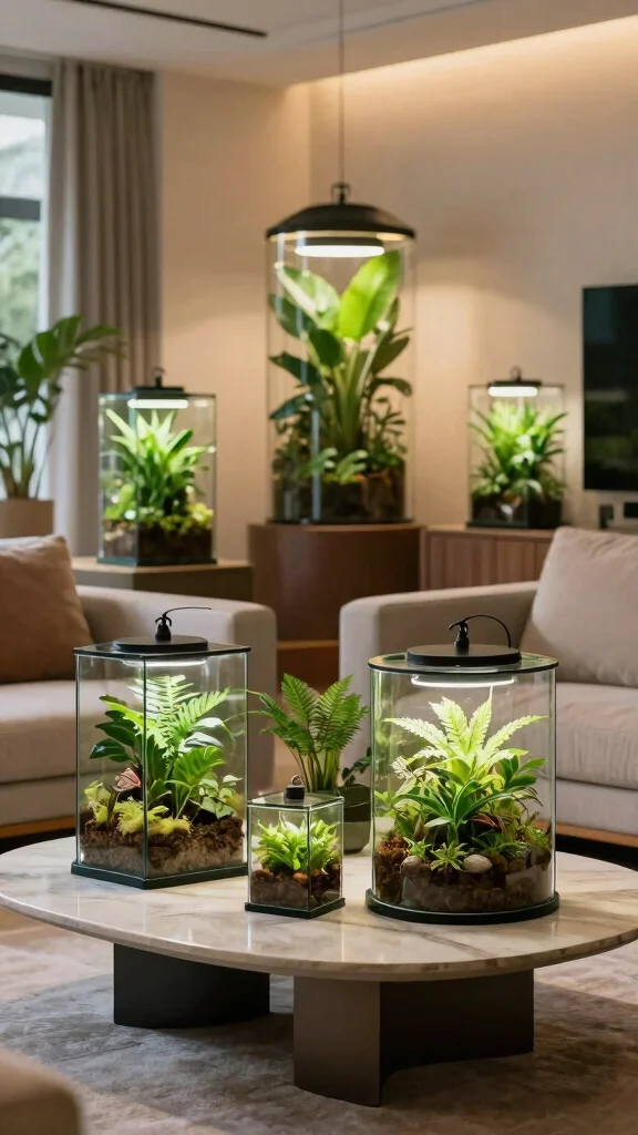 Incorporating terrariums into your decor enriches your living space, blending nature with modern vase design beautifully.