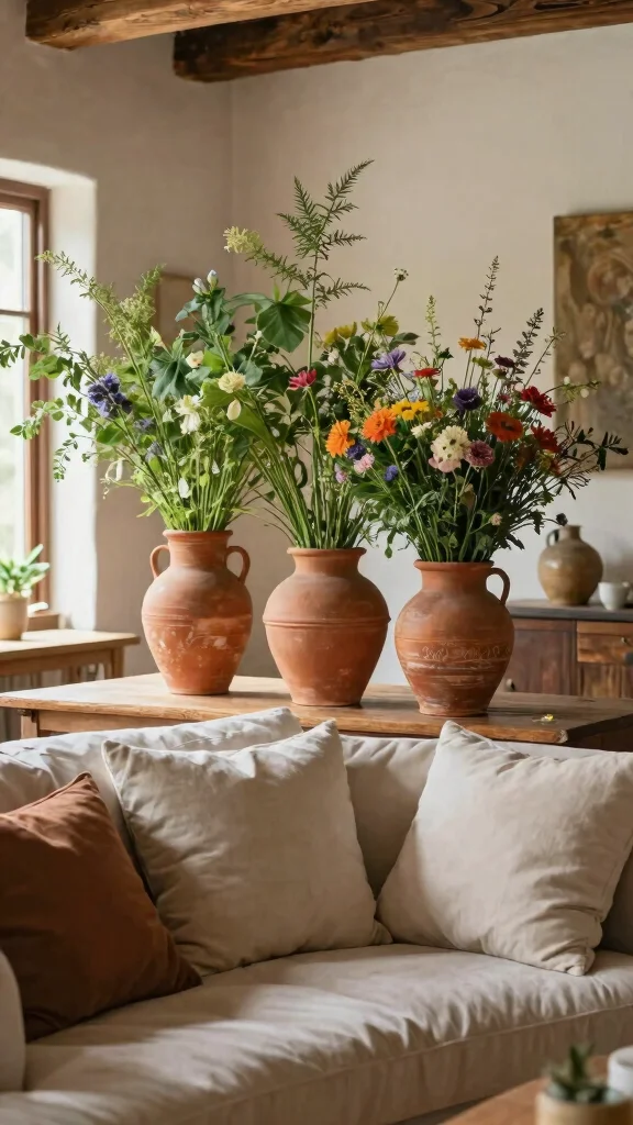 Add terracotta vases to infuse warmth and texture into your space, perfect for a cozy atmosphere.