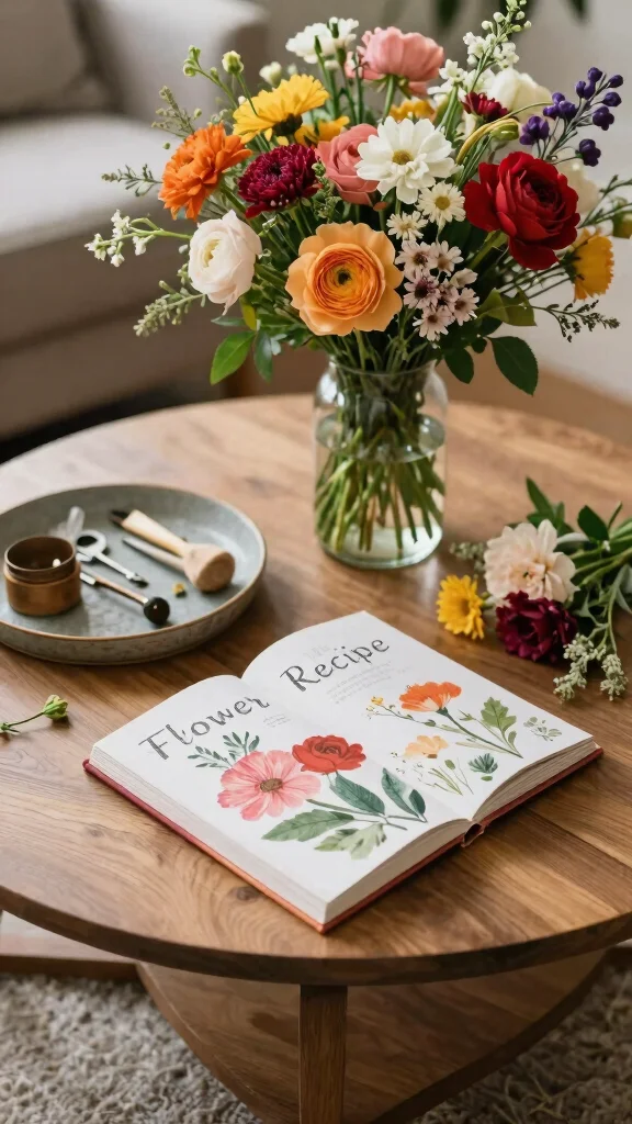 To enhance the display, consider placing fresh flowers from your garden or local market alongside the book. This thoughtful touch will invite conversation about floral arrangements and gardening, creating a warm and inviting atmosphere for gatherings.