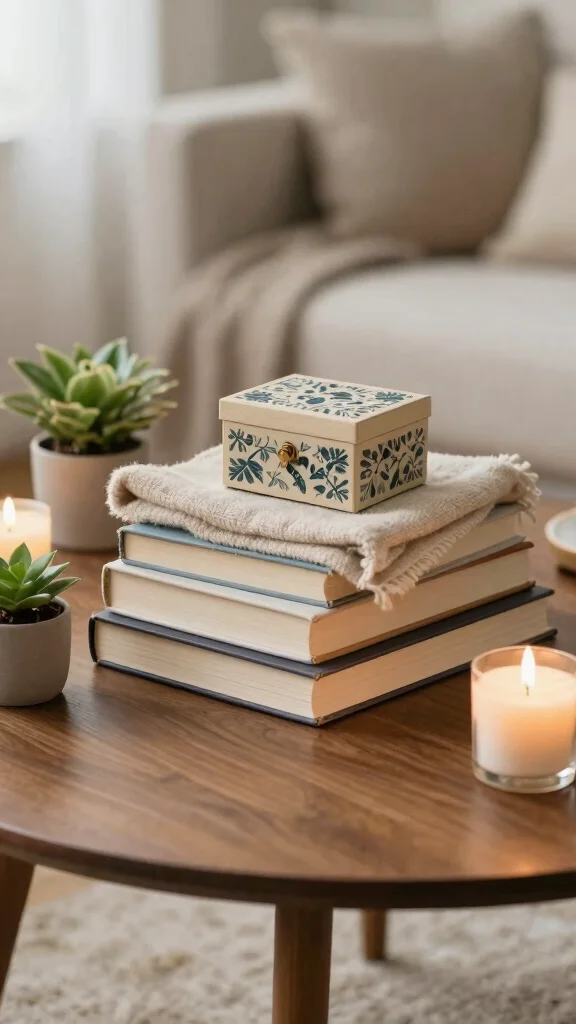 Create an inviting layered look by thoughtfully mixing books with decorative items. Start with a stack of two to three books as a base, then top it with a cozy throw or a decorative box. These layers evoke a sense of warmth and depth, making your coffee table even more welcoming.