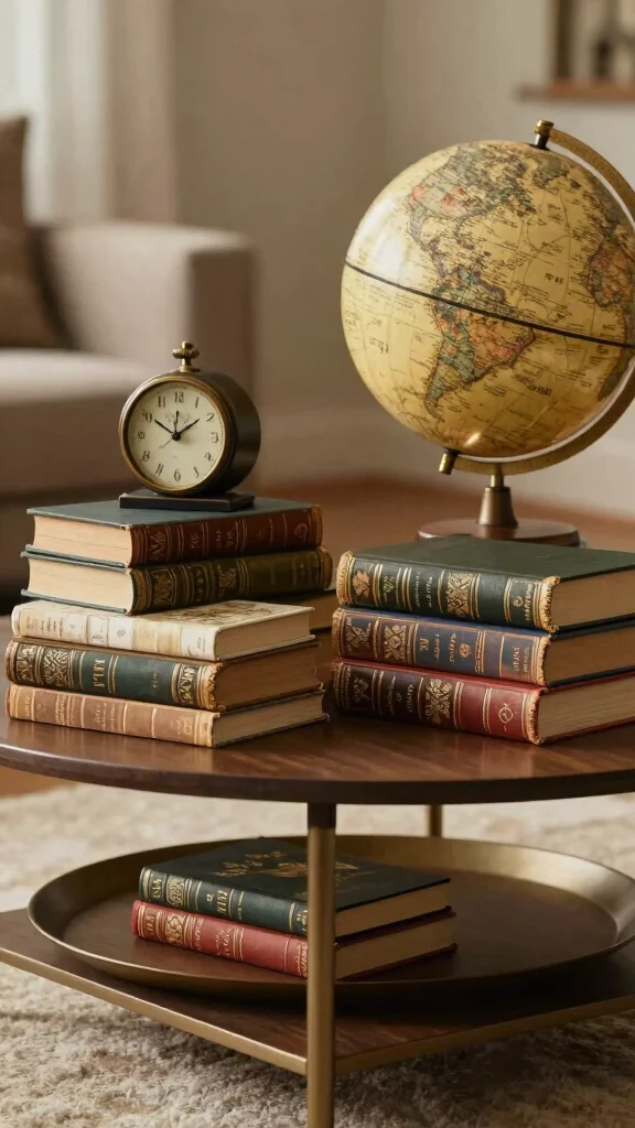 Introduce character to your coffee table with vintage books that tell intriguing stories. Stack old books featuring beautiful covers or unique bindings, blending them with antique decorative items like a small globe or a vintage clock. This nostalgic arrangement evokes memories and encourages conversation.