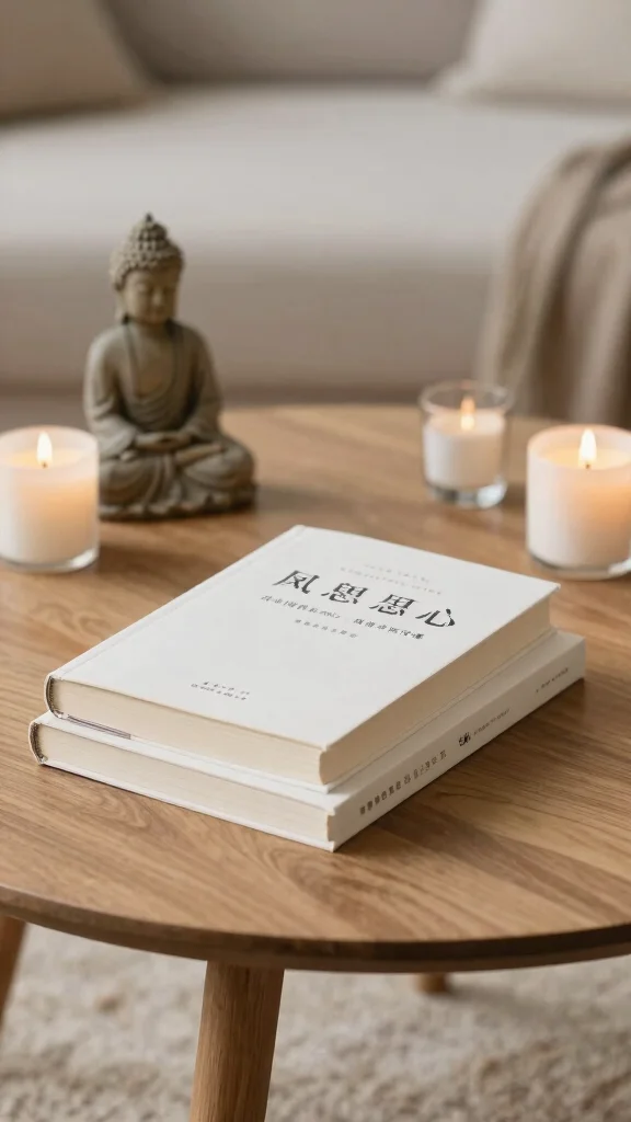 Design a calming zen space on your coffee table by stacking books focused on mindfulness, meditation, or self-care. Pair these with serene elements like a small Buddha statue, soothing candles, or calming essential oils. This arrangement promotes relaxation and encourages moments of peaceful reflection.