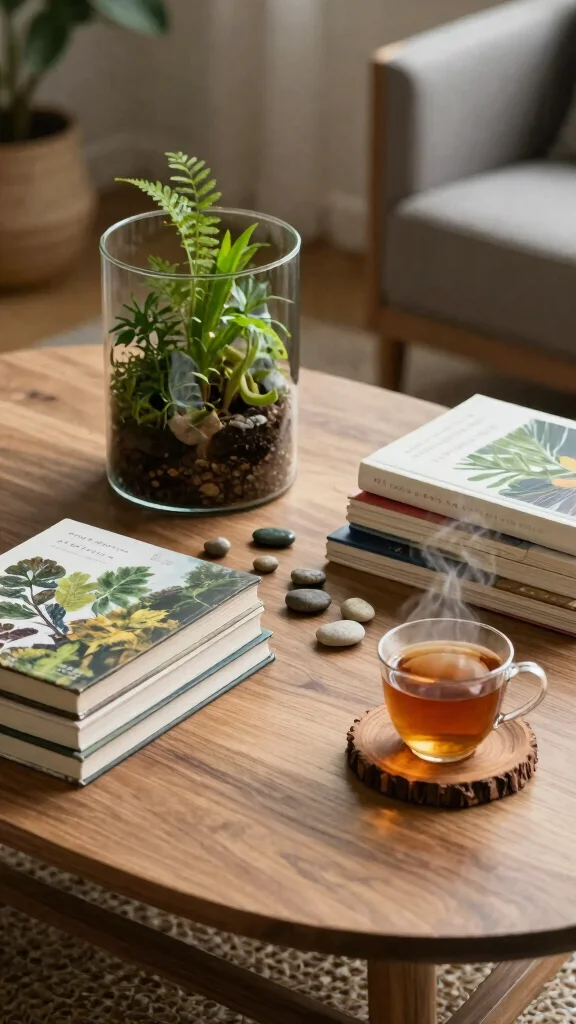 Bring the tranquility of nature indoors with a nature-inspired coffee table display. Select books that celebrate themes of nature, gardening, or wildlife, and pair them with natural elements like stones, branches, or potted plants. This combination not only adds a refreshing touch but also fosters a peaceful, organic vibe in your living area.