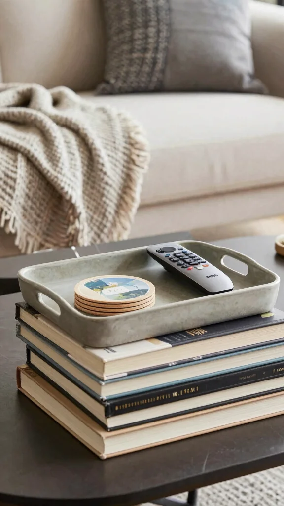 Elevate your coffee table’s aesthetic by incorporating functional decor that enhances its usability. Use a stack of books as a base for practical items, like a decorative tray holding remote controls, coasters, or small snacks. This clever approach allows your coffee table to remain stylish while serving a practical purpose.