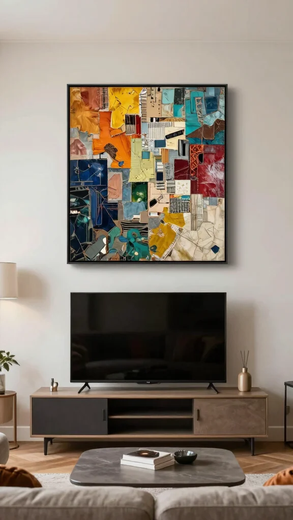Mixing media isn’t chaos—it’s texture with personality for your tv wall art ideas living room. Place a few mixed media pieces near the TV to create a striking focal point that invites conversation, while keeping the space minimalist and inviting.