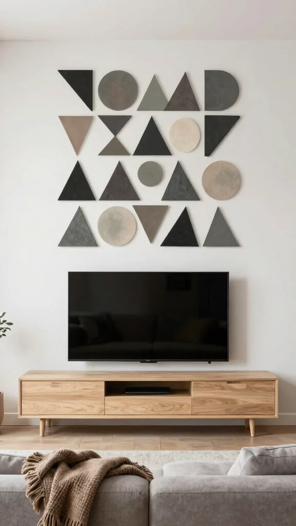 Go with modern wall art ideas that won’t overpower the screen: geometric canvases in muted tones, metal wall sculptures, wood panels with subtle grain, or abstract shapes that echo a color from your furniture. Keep the displays balanced with creative wall displays and avoid busy patterns that compete with the TV. Use lighting and placement to anchor the art as part of your media room decoration while keeping the TV as the focal point.