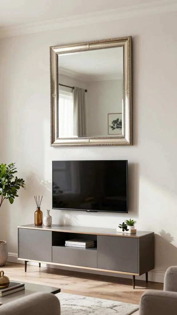 A large statement mirror isn’t just for reflection; it’s a space saver. When placed near your TV, it doubles light and visually widens the room. Use a frame that fits your tv wall art ideas living room style, and enjoy effortless calm.