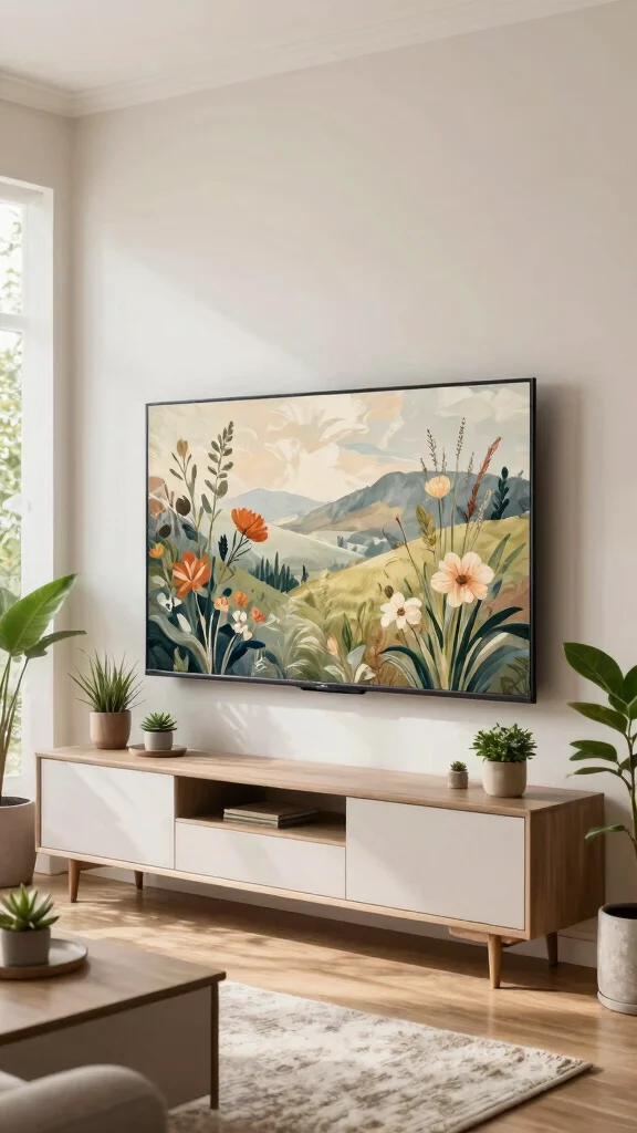 To maintain harmony, consider using frames that complement your decor style, whether it’s light wood, sleek metal, or chic acrylic. This art form resonates with modern design principles, allowing your TV to take center stage while providing an artistic backdrop.
