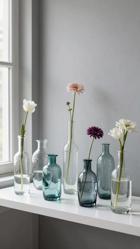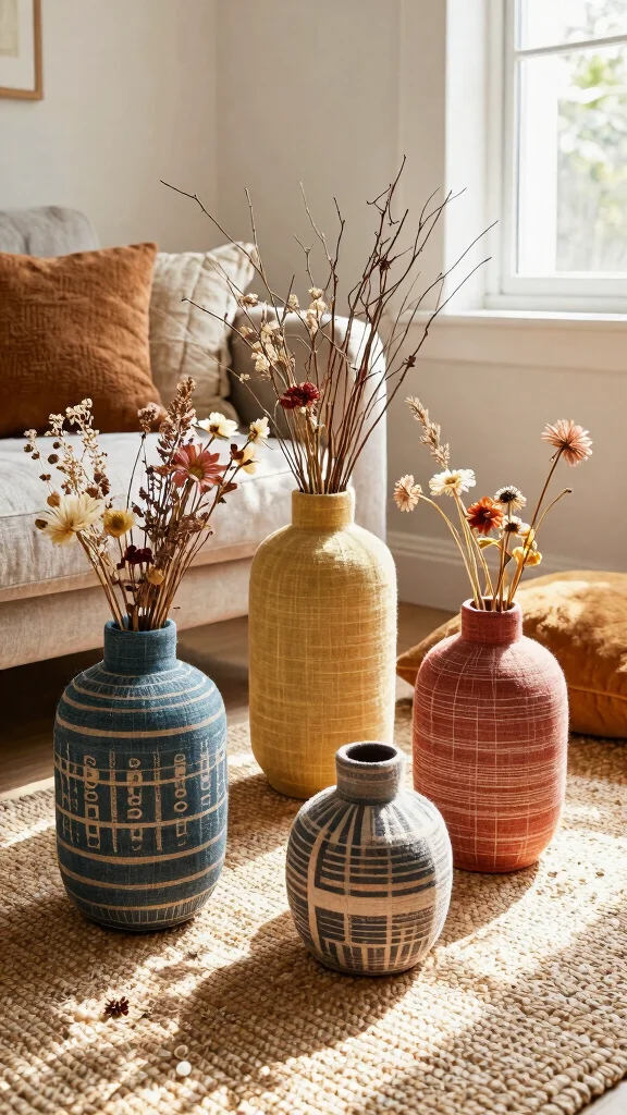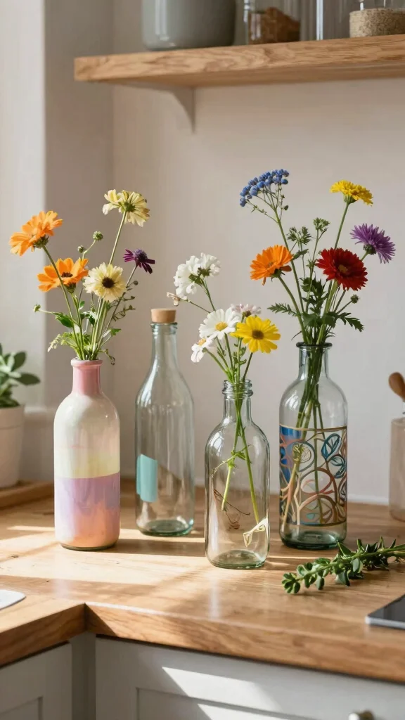 Fun fact: Upcycled bottles can cut household glass waste by 20% when you repurpose everyday jars into vases. Rinse, remove labels, and tint with paint; a small cluster of bottles with wildflowers creates an inviting, eco-friendly vibe—one simple addition to your vases decor ideas for any room.