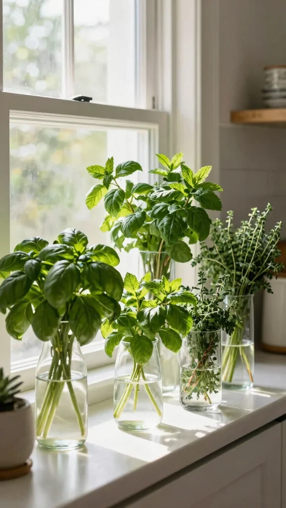 Embracing the beauty of a herb garden in clear glass vases can transform your kitchen into a vibrant oasis. The transparency of glass not only showcases the roots but also enhances the light exposure, promoting healthy growth. Mixing different heights and shapes, like a tall vase for basil and a short one for mint, creates a charming visual arrangement that brightens your cooking space.