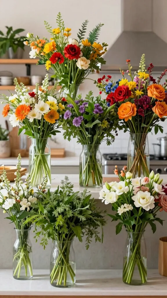 Rotate seasonal flowers in your vases for fresh decor that changes throughout the year, keeping your kitchen lively.