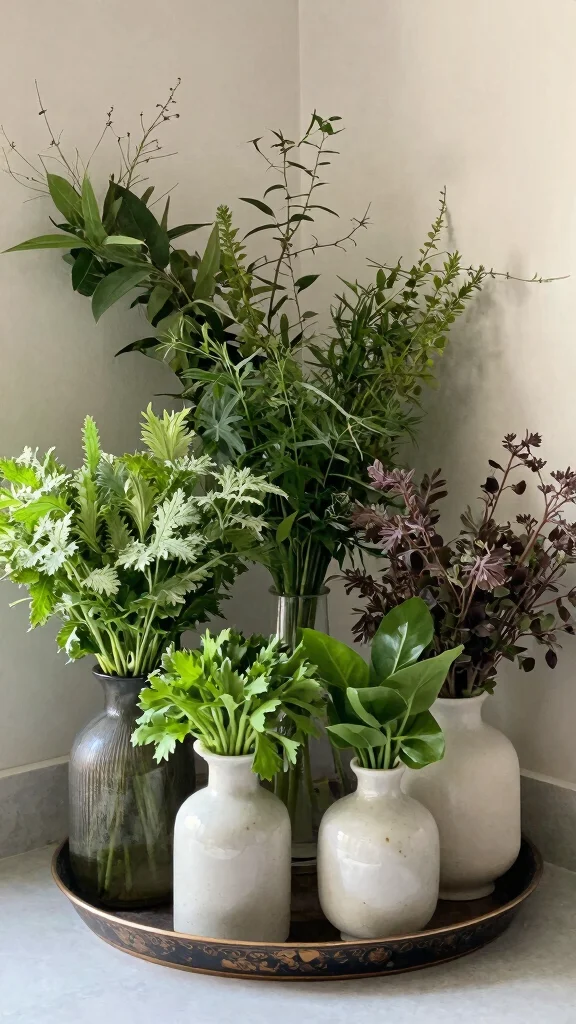 To keep the look simple yet sophisticated, opt for a few sprigs of herbs in each vase. Mixing metals such as copper and stainless steel creates a trendy contrast that adds depth to the decor. This style is also practical, as metal vases can be used for artificial plants, providing versatility.