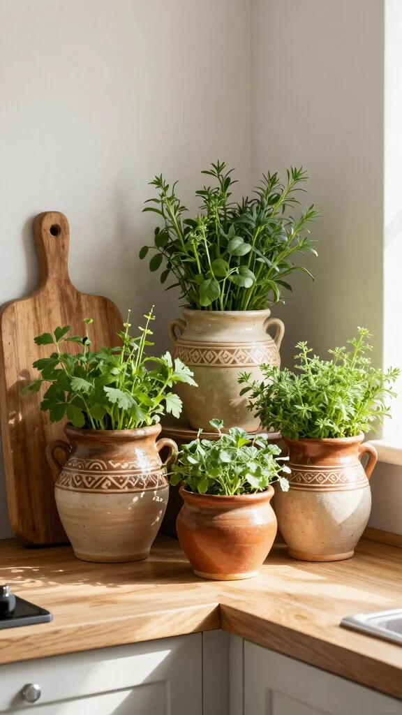 To enhance the rustic feel, select pots with drainage holes to ensure healthy herbs. Pair these with wooden accents like bamboo cutting boards for a unified look. This combination creates a homey vibe while being friendly on your wallet, as many ceramic pots can be found at budget-friendly stores.