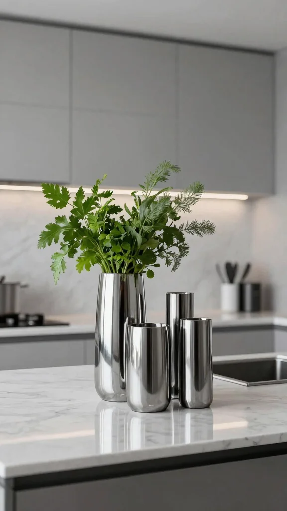 For a sleek and contemporary kitchen, minimalist metal vases offer an elegant touch. Their reflective surfaces can brighten up the space while maintaining a clean aesthetic. These vases can house fresh herbs or stand alone as striking decor, fitting seamlessly into a modern design scheme.
