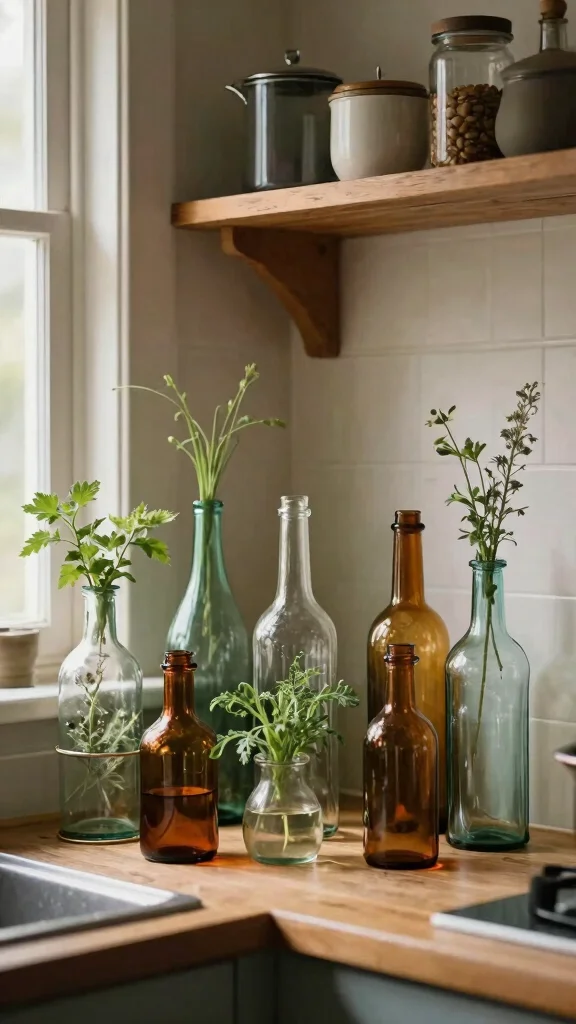 Vintage glass bottles introduce a delightful charm to your kitchen decor. Their unique shapes and sizes can serve as beautiful vases for herbs while adding character to your space. By grouping various bottles, you create an eclectic display that tells a story and brings warmth to your cooking area.