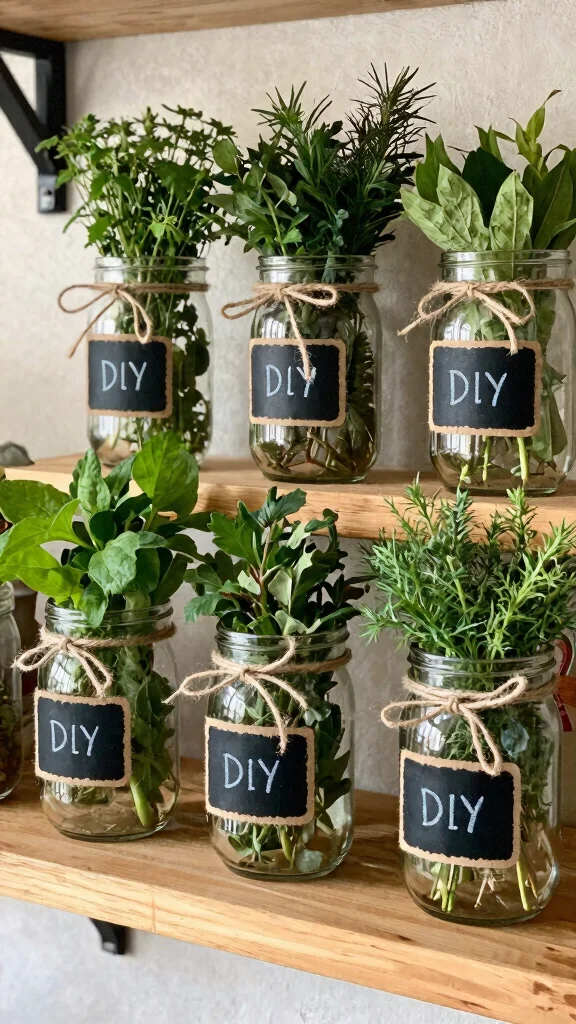 To maximize visual interest, use a variety of jar sizes. They can be hung on the wall or placed on countertops, offering flexibility in how you display your herbs. This DIY approach is not only budget-friendly but also encourages creativity in your decor.