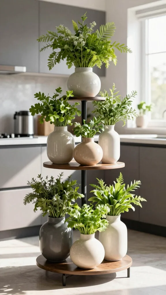 Multi-tiered plant stands can elevate your kitchen decor by providing a stunning display for your vases. This approach not only saves counter space but also adds visual interest by showcasing herbs at different heights. Placing this stand near a window allows your plants to soak up sunlight while making a striking statement in your kitchen.