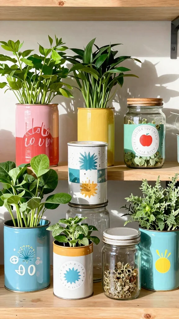 Utilizing upcycled containers not only beautifies your kitchen but also promotes a greener approach to home decor.