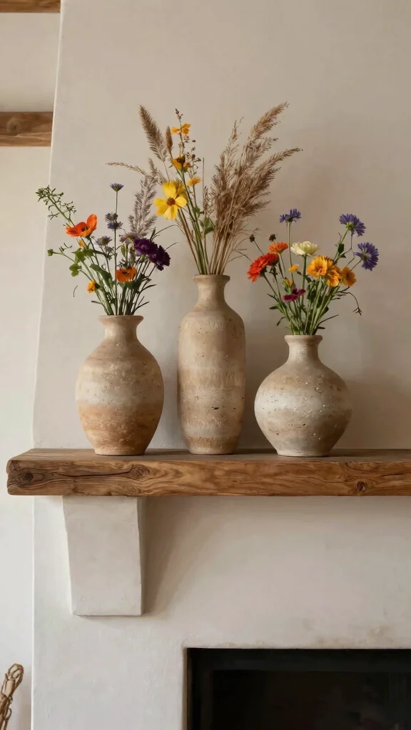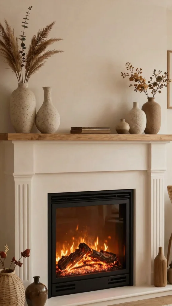 Add texture to your mantle with woven fiber vases, creating a warm and inviting atmosphere.