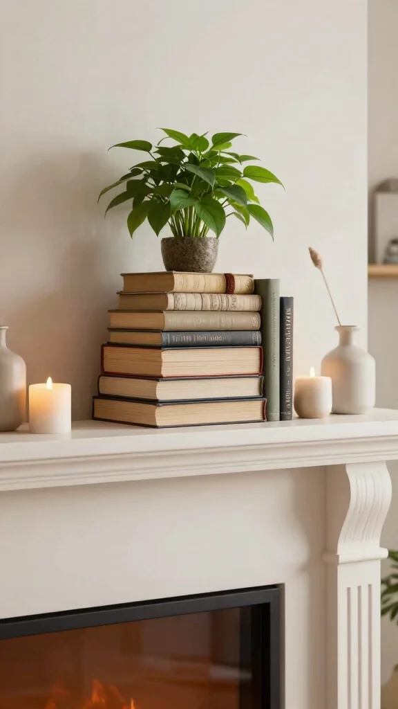 Combine function with style by transforming hardback books into whimsical vases. Cutting a hole in the pages of an old book creates a unique eco-friendly vase that can hold small plants or flowers. This imaginative approach is perfect for book lovers and adds a literary twist to your mantle decor. Stacking a few old books with a small vase on top can create added height and interest.