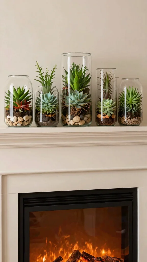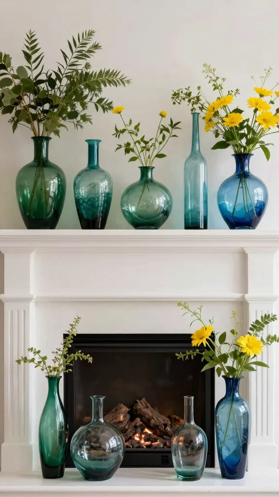 Did you know that using recycled glass vases on your mantle can cut waste and still boost style? Mix three sizes in greens and blues for a seaside vibe that stays fresh with every season.