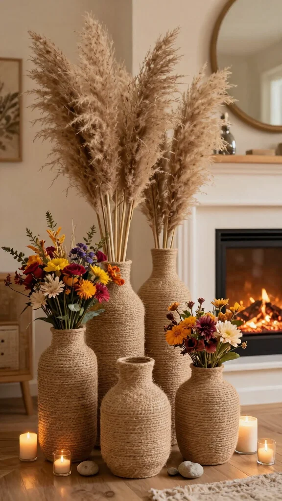 To elevate this look, consider mixing natural wood accents for a well-rounded aesthetic. Opt for colors that complement your existing decor for a harmonious feel. Surrounding the vases with decorative stones or driftwood can further enhance the earthy vibe.