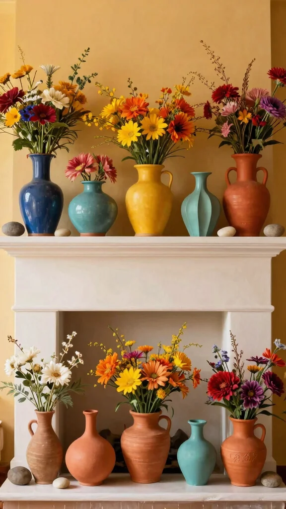 For a captivating display, cluster different shapes and sizes together. Using bold flowers that either match or contrast with the vase colors can create extra visual impact. Surrounding the vases with decorative stones or pebbles enhances the earthy feel, tying the whole arrangement together.