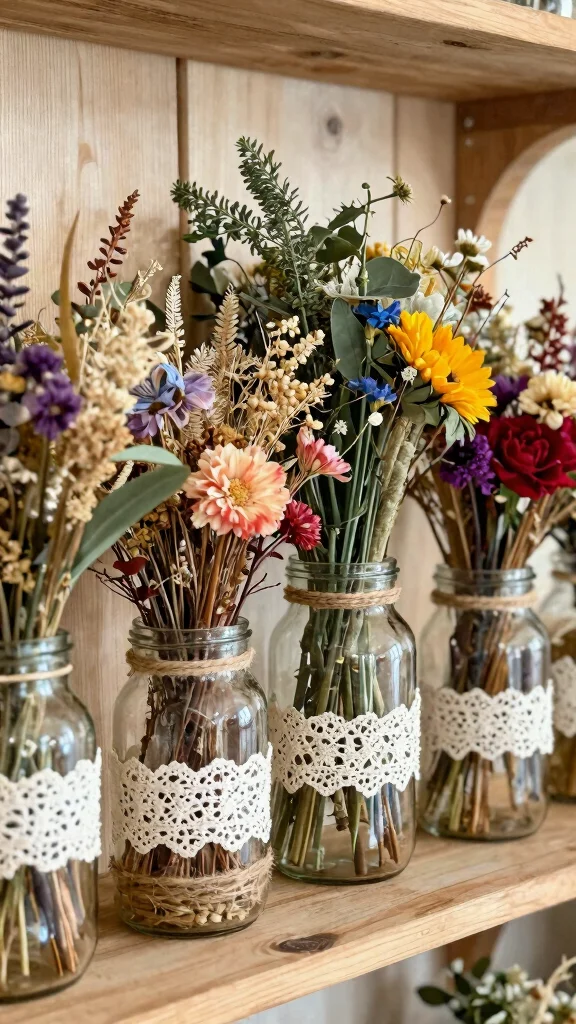 Utilizing upcycled jar vases creates a unique aesthetic that stands out. The blend of textures and personal craftsmanship enriches the overall design.