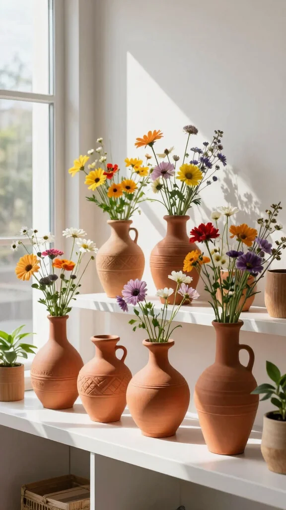 Terracotta vases enhance shelf decor effortlessly, while their natural materials create an inviting atmosphere that speaks to sustainability.