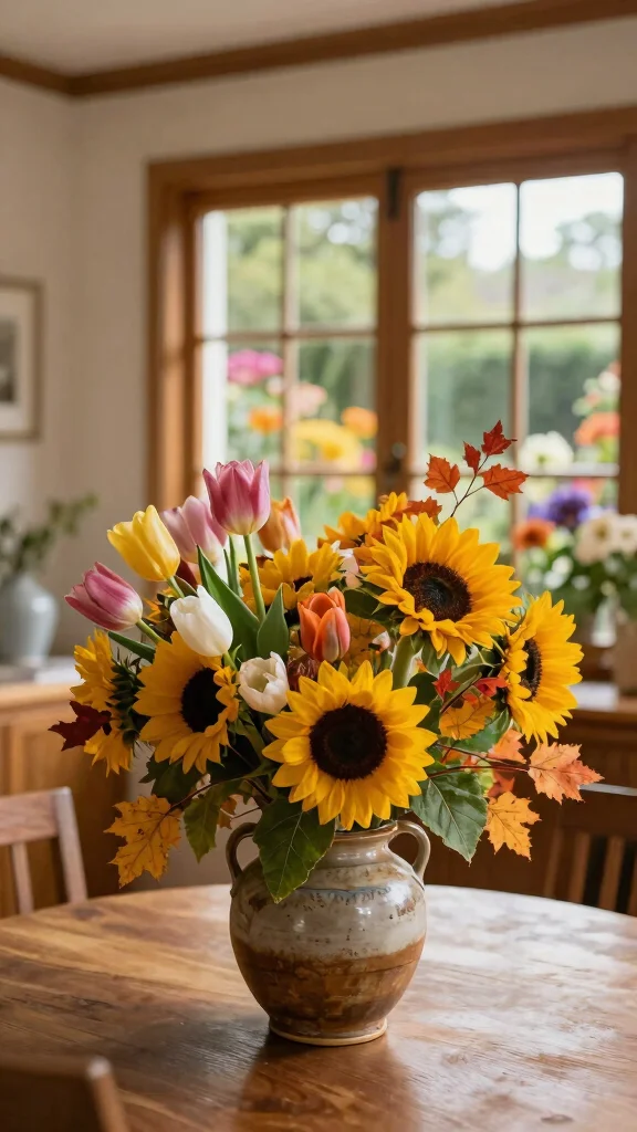 For spring, consider vibrant tulips or delicate cherry blossoms, while summer calls for bold sunflowers or cheerful zinnias. In the fall, embrace autumn leaves or chrysanthemums, and in winter, opt for evergreen sprigs or cozy poinsettias. You can often find these seasonal blooms at local farmers’ markets, ensuring quality and freshness.