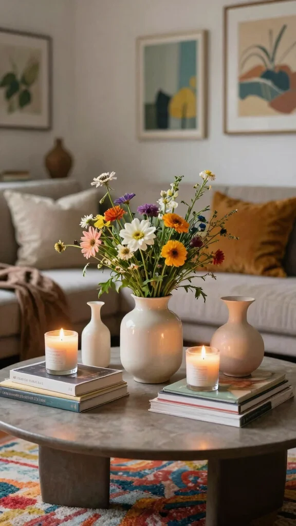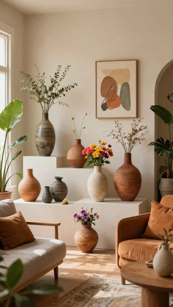 Add votive candles around your vases to create a warm ambiance, or stack books beneath them for an inviting layered look. Positioning vases near artwork can also help tie the room together, making the decor feel cohesive and thoughtfully arranged.