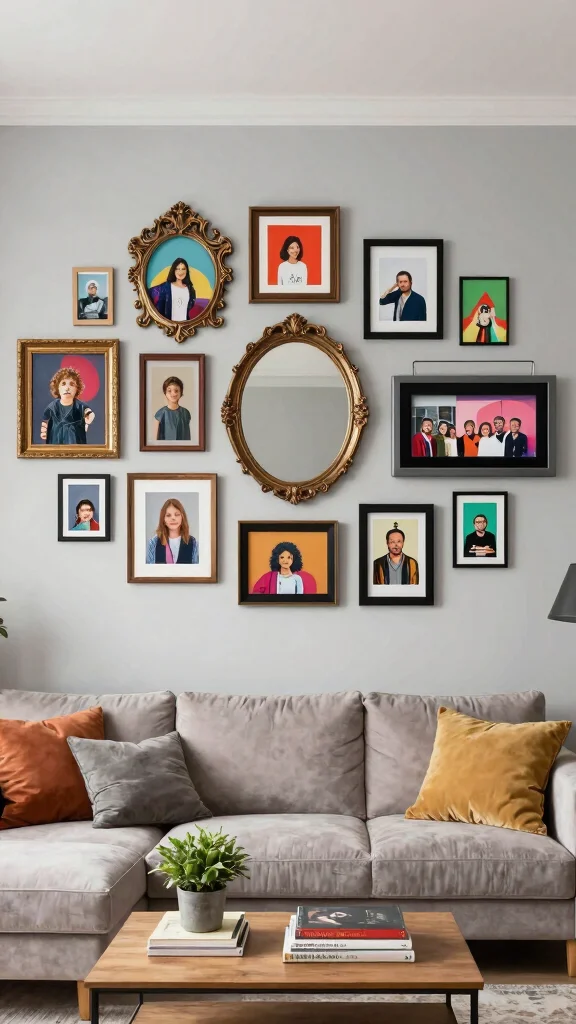 Embracing eclectic frames in a variety of sizes can infuse your living room with a warm, personal vibe. This design choice works beautifully by allowing you to blend vintage with modern elements, creating a visual story that reflects your unique journey through life. Consider using a large statement piece as the focal point, surrounded by smaller photographs or artworks that evoke cherished memories, making your wall a narrative of your experiences.